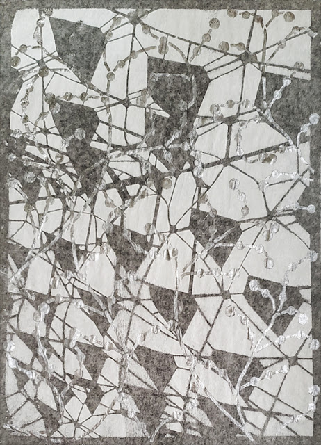 In the upper left of today's final combo, directly above, I've placed a double-print I made on the wet-strength tissue paper described in another post earlier this week. This tissue will be cut and/or torn to be included in a future collage. Since it's on wet-strength tissue, much of it will turn translucent or transparent after matte medium or gloss medium adheres it to the background support of the collage. The acrylic paints that I used -- metallic gold and plain purple -- will be nearly the only parts of the printed paper that will remain clearly visible.