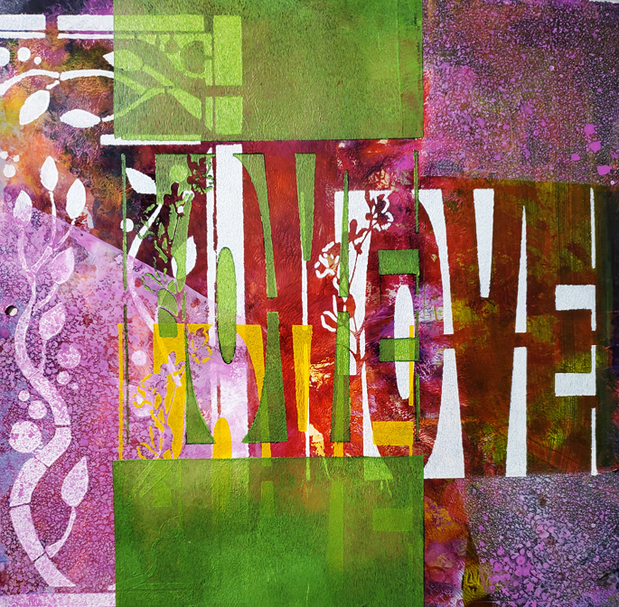 Masks and stencils like 6” x 6” Love can be used only “right-side-up” – unless I’m working with a Gelli Plate; for that, I place it “flip-side-up” onto the plate, so I’ll get a right-side-up print on paper that I press onto it.