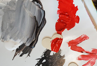 After I’m done using paints for my painting-in-progress, I place wooden craft hearts into the leftover dollops of wet paint. When I lift them, they’re partially coated with paint that boasts a delightful 3-dimensional “squished” pattern --